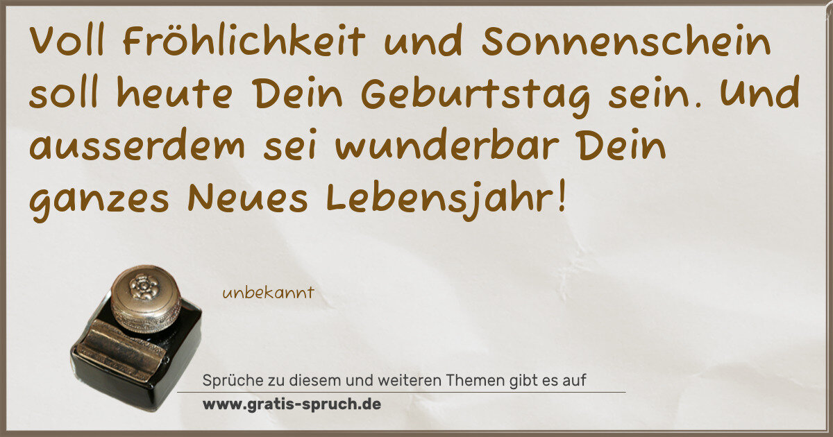 Voll Fröhlichkeit und Sonnenschein soll heute Dein Geburtstag sein. Und ausserdem sei wunderbar Dein ganzes Neues Lebensjahr!