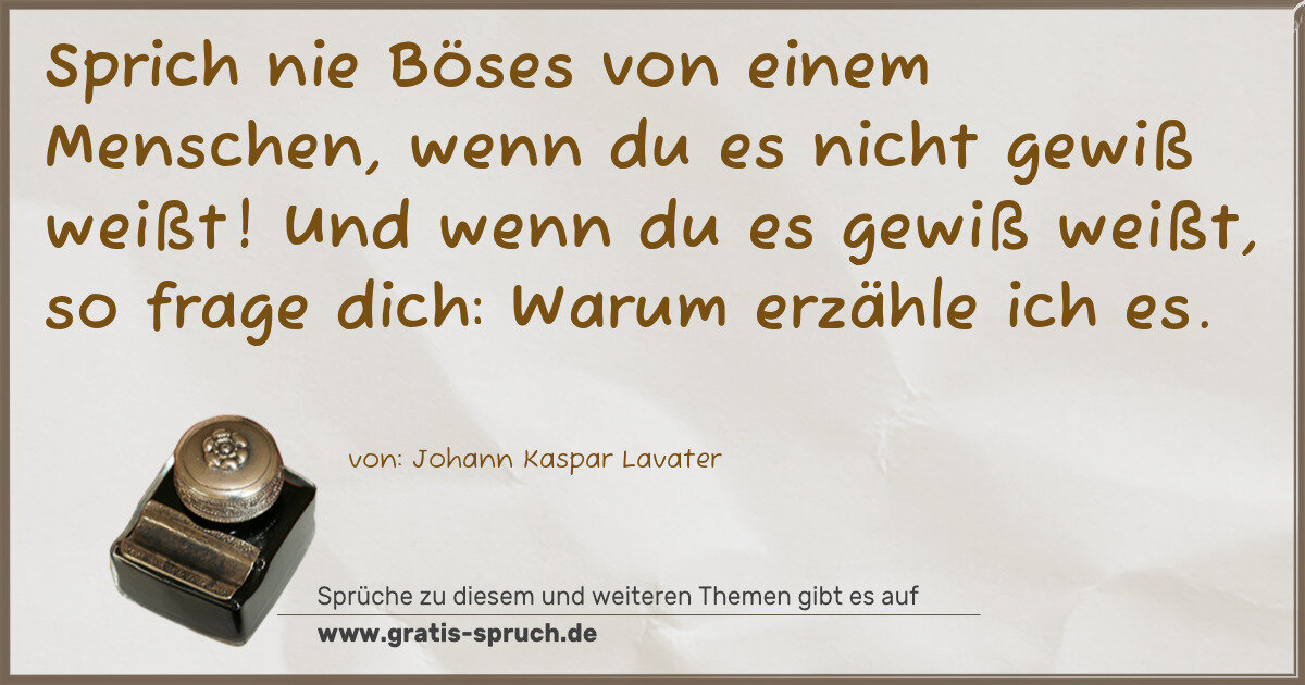 Sprich nie Böses von einem Menschen, wenn du es nicht gewiß weißt! Und wenn du es gewiß weißt, so frage dich: Warum erzähle ich es.