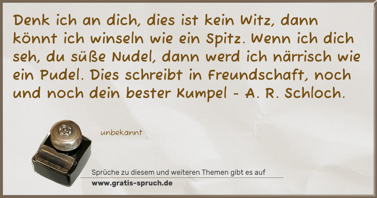 Denk ich an dich, dies ist kein Witz, dann könnt ich winseln wie ein Spitz. Wenn ich dich seh, du süße Nudel, dann werd ich närrisch wie ein Pudel. Dies schreibt in Freundschaft, noch und noch dein bester Kumpel - A …