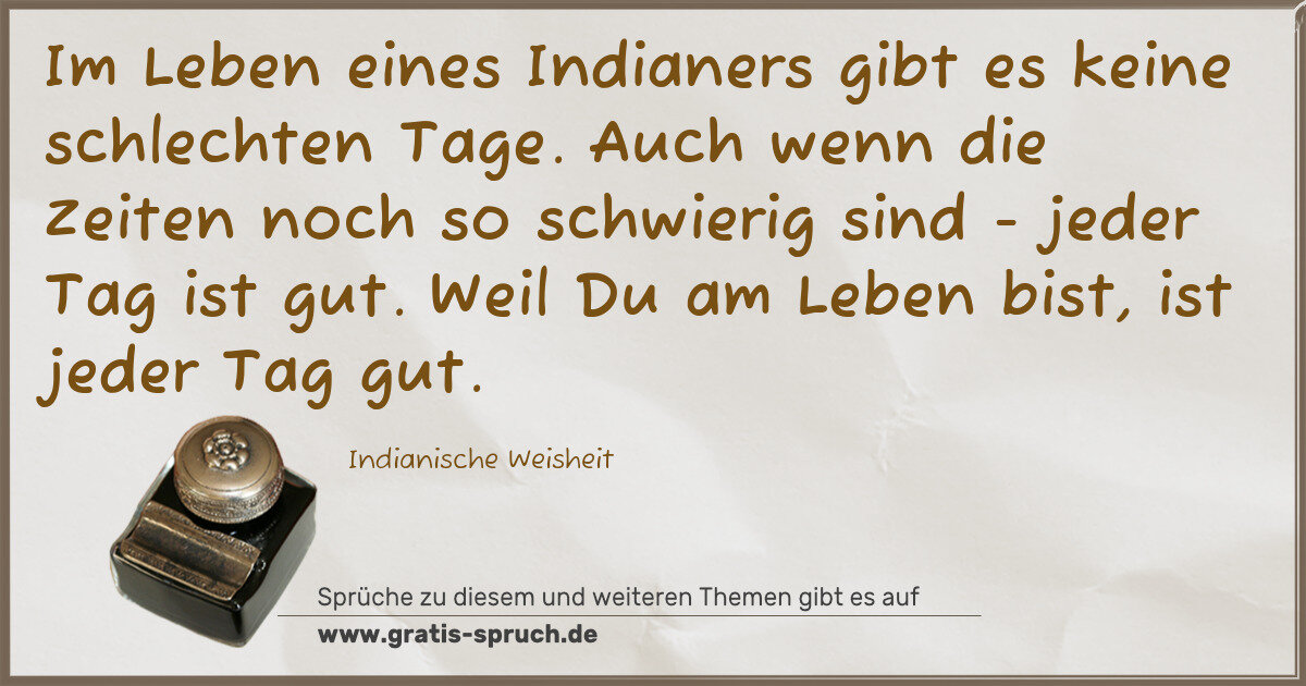 Im Leben eines Indianers gibt es keine schlechten Tage. Auch wenn die Zeiten noch so schwierig sind - jeder Tag ist gut. Weil Du am Leben bist, ist jeder Tag gut.