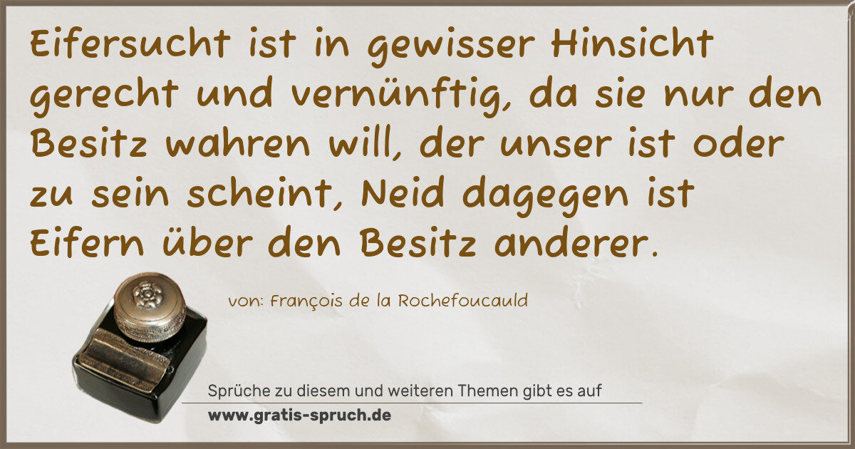 Eifersucht ist in gewisser Hinsicht gerecht und vernünftig, da sie nur den Besitz wahren will, der unser ist oder zu sein scheint, Neid dagegen ist Eifern über den Besitz anderer.