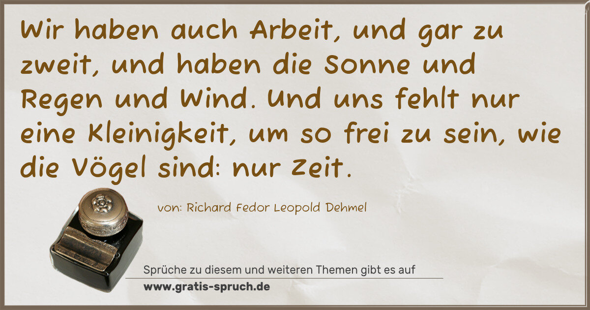 Wir haben auch Arbeit, und gar zu zweit, und haben die Sonne und Regen und Wind. Und uns fehlt nur eine Kleinigkeit, um so frei zu sein, wie die Vögel sind: nur Zeit.