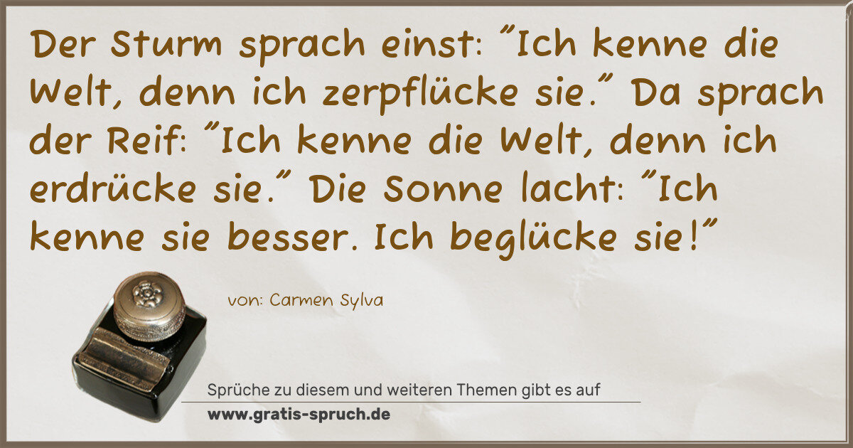 Der Sturm sprach einst: "Ich kenne die Welt, denn ich zerpflücke sie." Da sprach der Reif: "Ich kenne die Welt, denn ich erdrücke sie." Die Sonne lacht: "Ich kenne sie besser. Ich beglücke sie!"