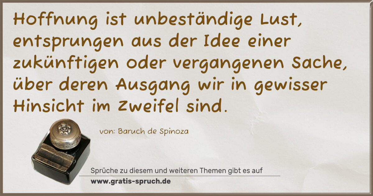 Hoffnung ist unbeständige Lust, entsprungen aus der Idee einer zukünftigen oder vergangenen Sache, über deren Ausgang wir in gewisser Hinsicht im Zweifel sind.