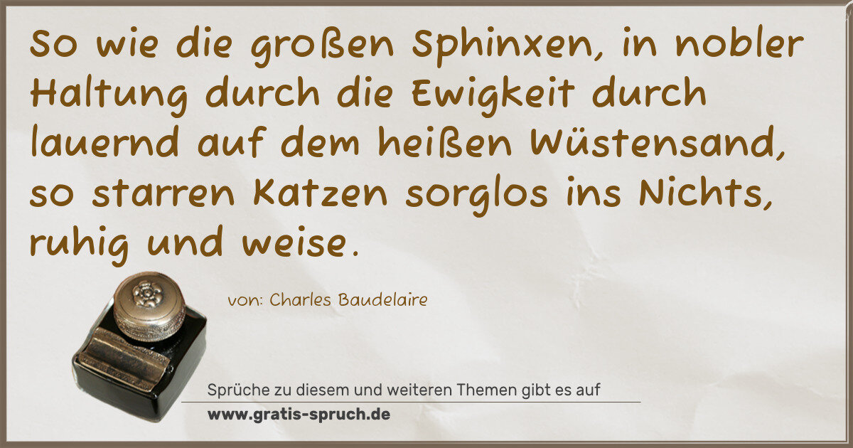 So wie die großen Sphinxen, in nobler Haltung durch die Ewigkeit durch lauernd auf dem heißen Wüstensand, so starren Katzen sorglos ins Nichts, ruhig und weise.