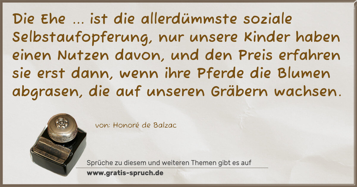Die Ehe ... ist die allerdümmste soziale Selbstaufopferung, nur unsere Kinder haben einen Nutzen davon, und den Preis erfahren sie erst dann, wenn ihre Pferde die Blumen abgrasen, die auf unseren Gräbern wachsen.