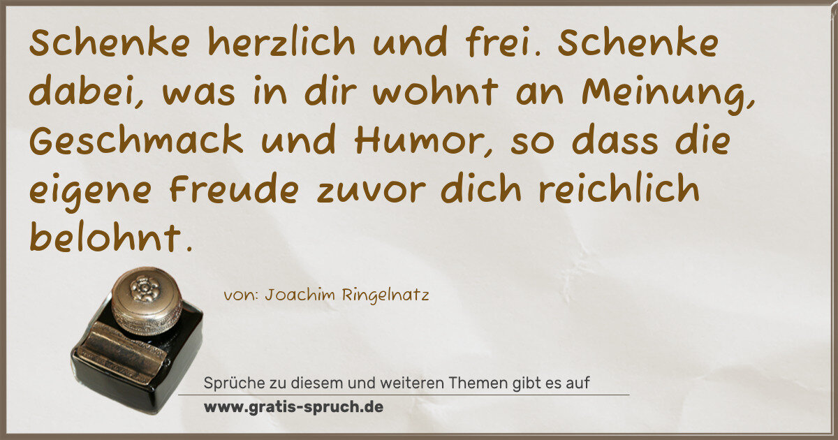 Schenke herzlich und frei. Schenke dabei, was in dir wohnt an Meinung, Geschmack und Humor, so dass die eigene Freude zuvor dich reichlich belohnt.