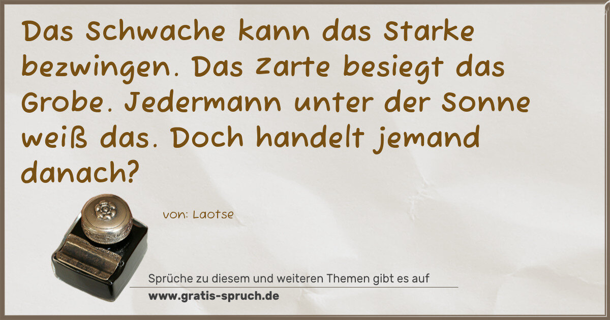 Das Schwache kann das Starke bezwingen. Das Zarte besiegt das Grobe. Jedermann unter der Sonne weiß das. Doch handelt jemand danach?