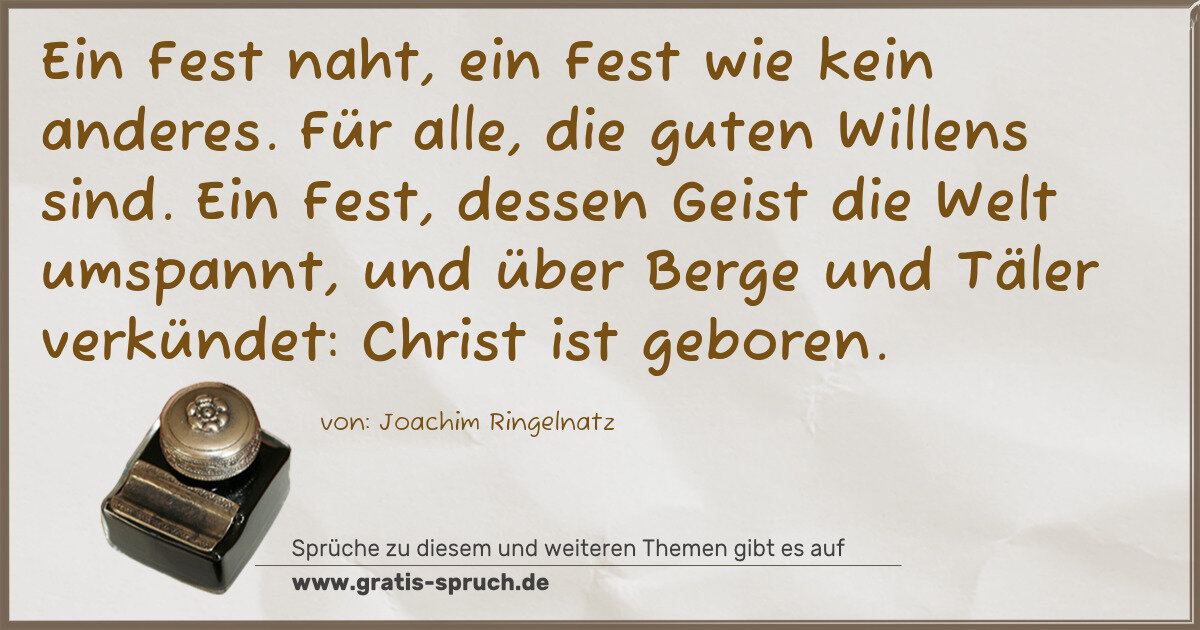 Ein Fest naht, ein Fest wie kein anderes. Für alle, die guten Willens sind. Ein Fest, dessen Geist die Welt umspannt, und über Berge und Täler verkündet: Christ ist geboren.