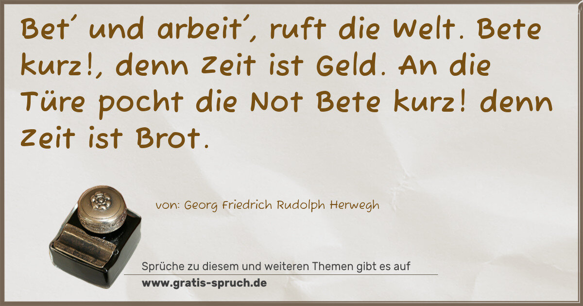 Bet' und arbeit', ruft die Welt. Bete kurz!, denn Zeit ist Geld. An die Türe pocht die Not Bete kurz! denn Zeit ist Brot.