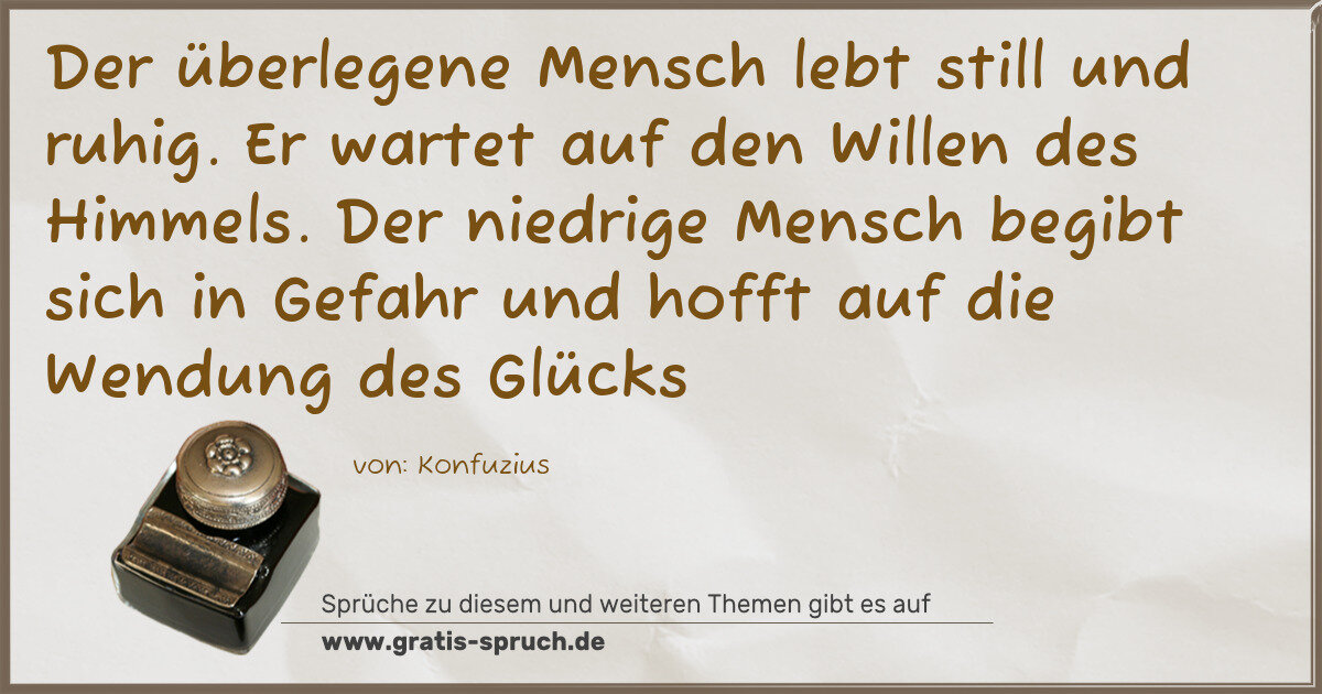 Der überlegene Mensch lebt still und ruhig. Er wartet auf den Willen des Himmels. Der niedrige Mensch begibt sich in Gefahr und hofft auf die Wendung des Glücks