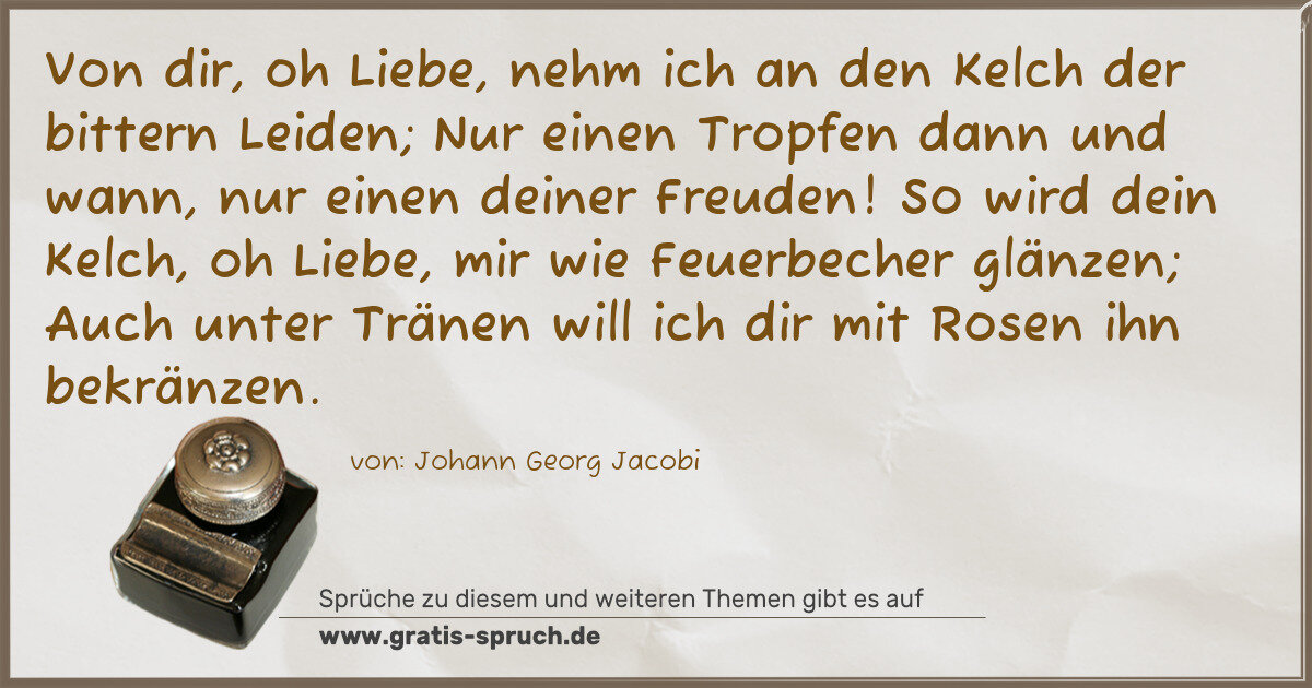 Von dir, oh Liebe, nehm ich an den Kelch der bittern Leiden; Nur einen Tropfen dann und wann, nur einen deiner Freuden! So wird dein Kelch, oh Liebe, mir wie Feuerbecher glänzen; Auch unter Tränen will ich dir mit Rosen ihn bekränzen.