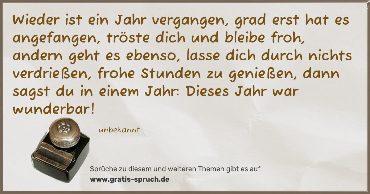 Wieder ist ein Jahr vergangen, grad erst hat es angefangen, tröste dich und bleibe froh, andern geht es ebenso, lasse dich durch nichts verdrießen, frohe Stunden zu genießen, dann sagst du in einem Jahr: Dieses Jahr war wunderbar!