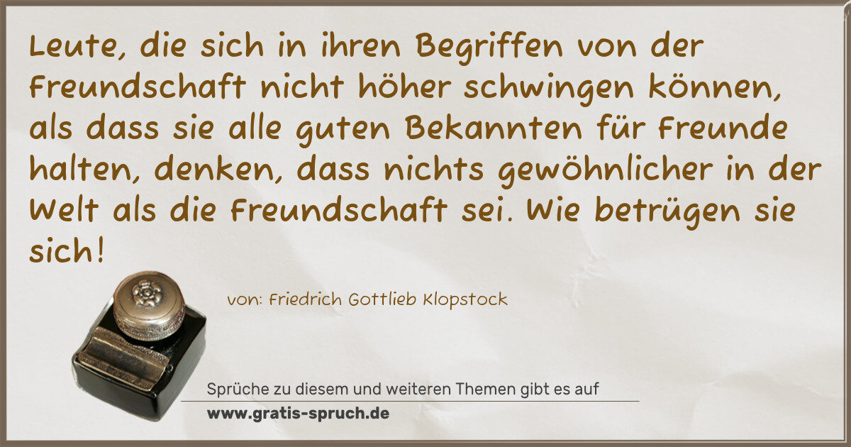Leute, die sich in ihren Begriffen von der Freundschaft nicht höher schwingen können, als dass sie alle guten Bekannten für Freunde halten, denken, dass nichts gewöhnlicher in der Welt als die Freundschaft sei. Wie betrügen sie sich!
