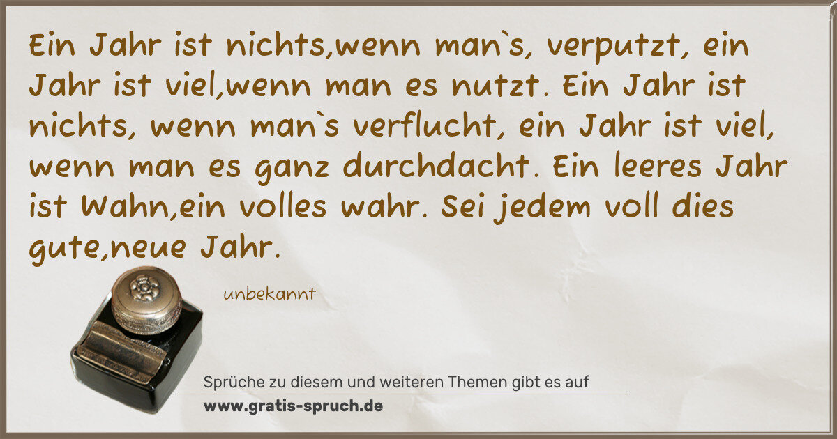 Ein Jahr ist nichts,wenn man`s, verputzt, ein Jahr ist viel,wenn man es nutzt. Ein Jahr ist nichts, wenn man`s verflucht, ein Jahr ist viel, wenn man es ganz durchdacht. Ein leeres Jahr ist Wahn,ein volles wahr. Sei jedem voll dies gute,neue Jahr.