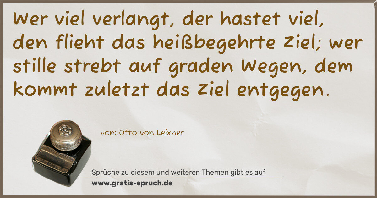 Wer viel verlangt, der hastet viel, den flieht das heißbegehrte Ziel; wer stille strebt auf graden Wegen, dem kommt zuletzt das Ziel entgegen.