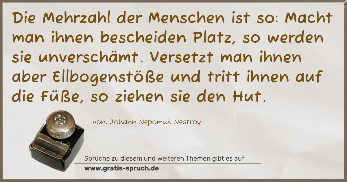 Die Mehrzahl der Menschen ist so: Macht man ihnen bescheiden Platz, so werden sie unverschämt. Versetzt man ihnen aber Ellbogenstöße und tritt ihnen auf die Füße, so ziehen sie den Hut.