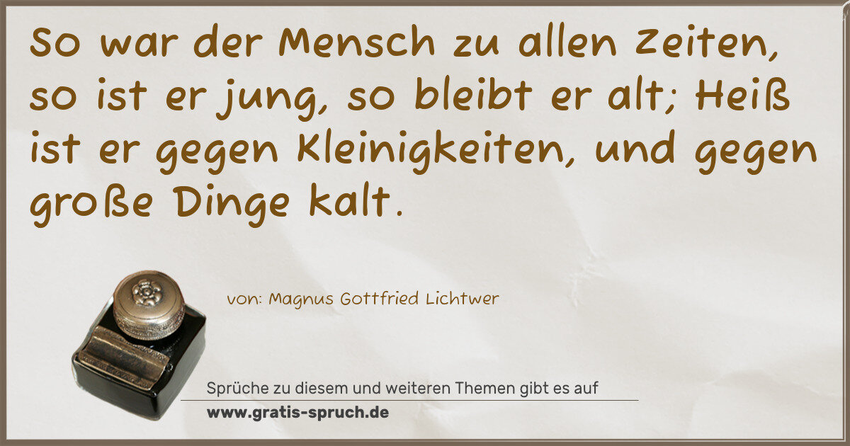 So war der Mensch zu allen Zeiten, so ist er jung, so bleibt er alt; Heiß ist er gegen Kleinigkeiten, und gegen große Dinge kalt.