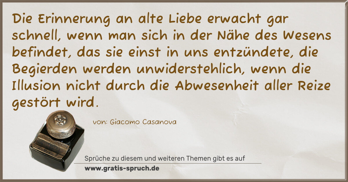 Die Erinnerung an alte Liebe erwacht gar schnell, wenn man sich in der Nähe des Wesens befindet, das sie einst in uns entzündete, die Begierden werden unwiderstehlich, wenn die Illusion nicht durch die Abwesenheit aller Reize gestört wird.