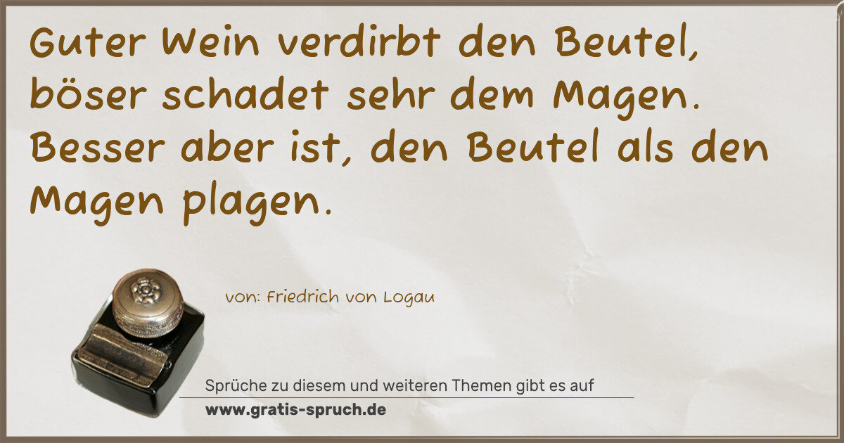 Guter Wein verdirbt den Beutel, böser schadet sehr dem Magen. Besser aber ist, den Beutel als den Magen plagen.