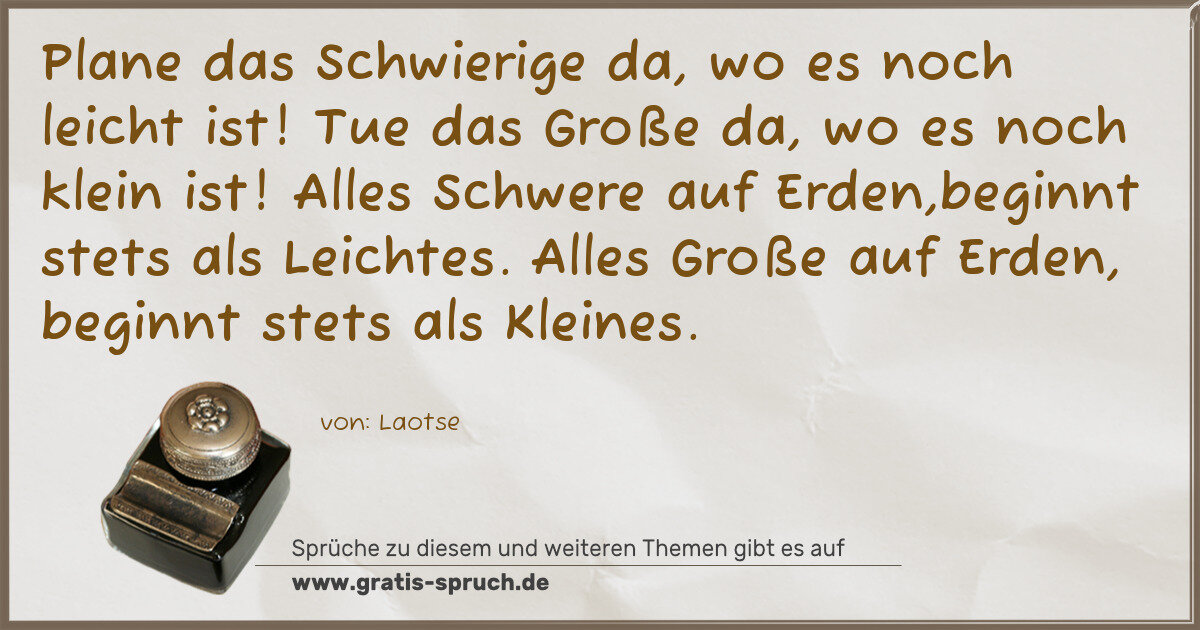 Plane das Schwierige da, wo es noch leicht ist! Tue das Große da, wo es noch klein ist! Alles Schwere auf Erden,beginnt stets als Leichtes. Alles Große auf Erden, beginnt stets als Kleines.
