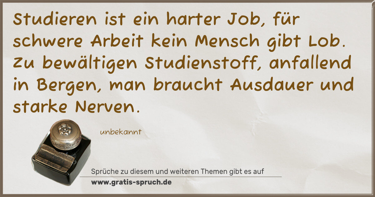Studieren ist ein harter Job, für schwere Arbeit kein Mensch gibt Lob. Zu bewältigen Studienstoff, anfallend in Bergen, man braucht Ausdauer und starke Nerven.