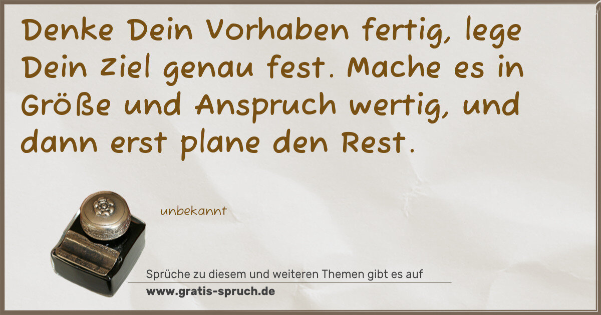 Denke Dein Vorhaben fertig, lege Dein Ziel genau fest. Mache es in Größe und Anspruch wertig, und dann erst plane den Rest.