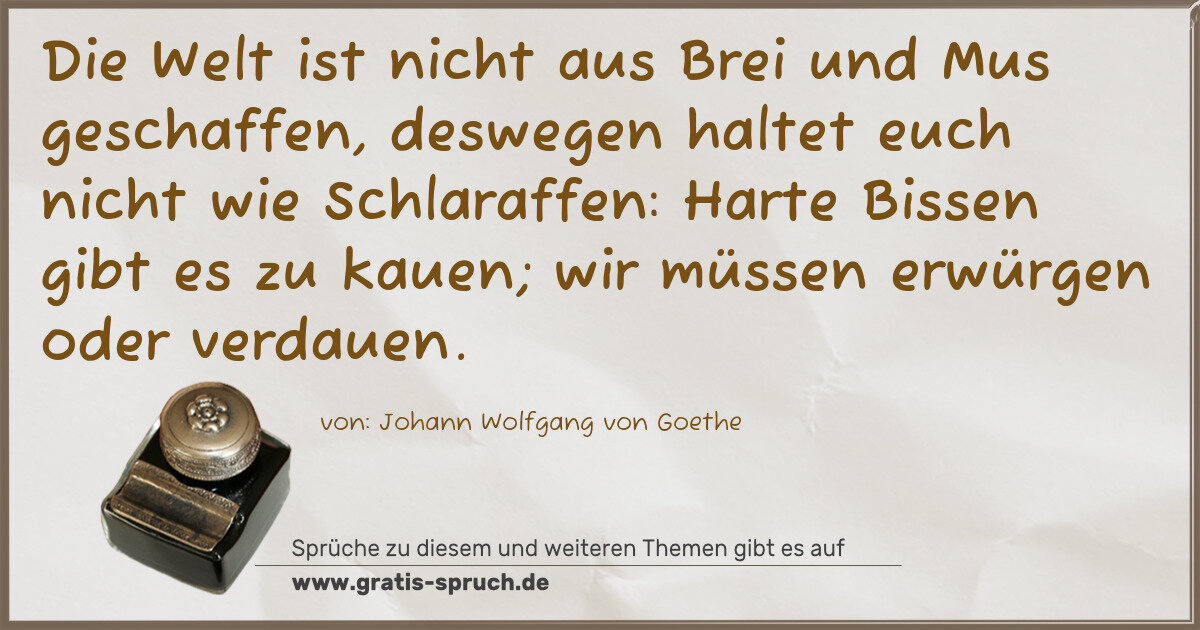 Die Welt ist nicht aus Brei und Mus geschaffen, deswegen haltet euch nicht wie Schlaraffen: Harte Bissen gibt es zu kauen; wir müssen erwürgen oder verdauen.