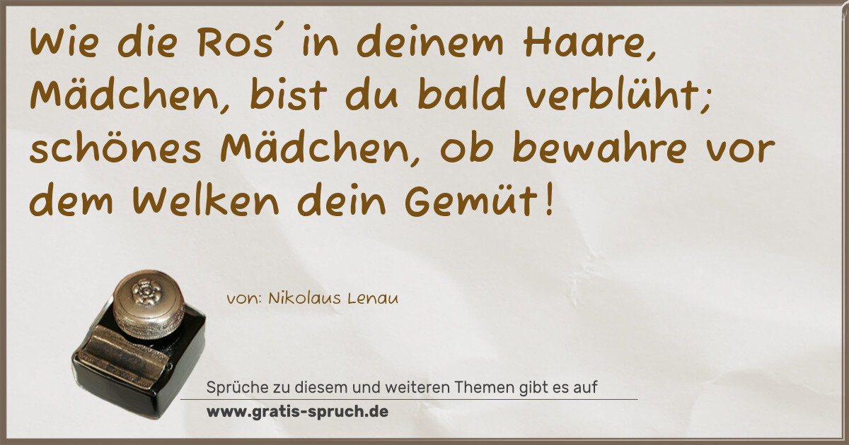 Wie die Ros' in deinem Haare, Mädchen, bist du bald verblüht; schönes Mädchen, ob bewahre vor dem Welken dein Gemüt!