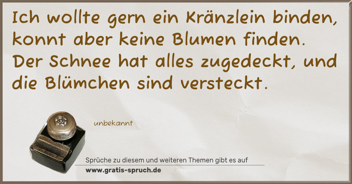 Ich wollte gern ein Kränzlein binden, konnt aber keine Blumen finden. Der Schnee hat alles zugedeckt, und die Blümchen sind versteckt.