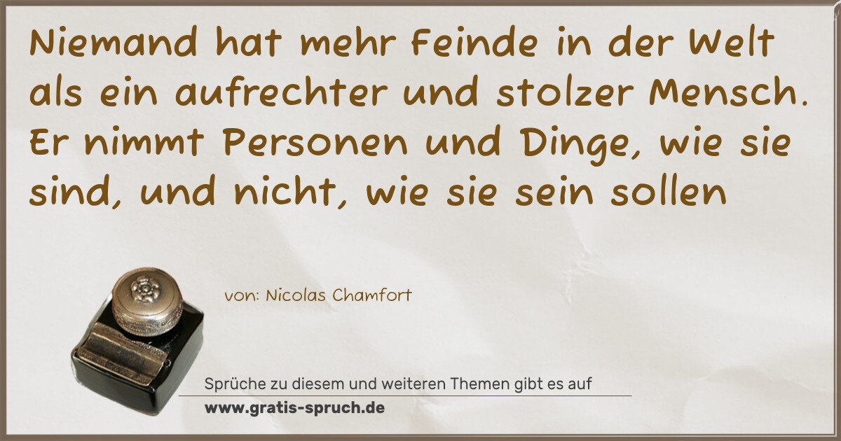Niemand hat mehr Feinde in der Welt als ein aufrechter und stolzer Mensch. Er nimmt Personen und Dinge, wie sie sind, und nicht, wie sie sein sollen