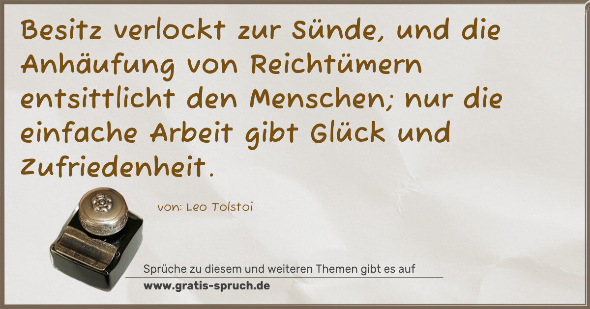 Besitz verlockt zur Sünde, und die Anhäufung von Reichtümern entsittlicht den Menschen; nur die einfache Arbeit gibt Glück und Zufriedenheit.