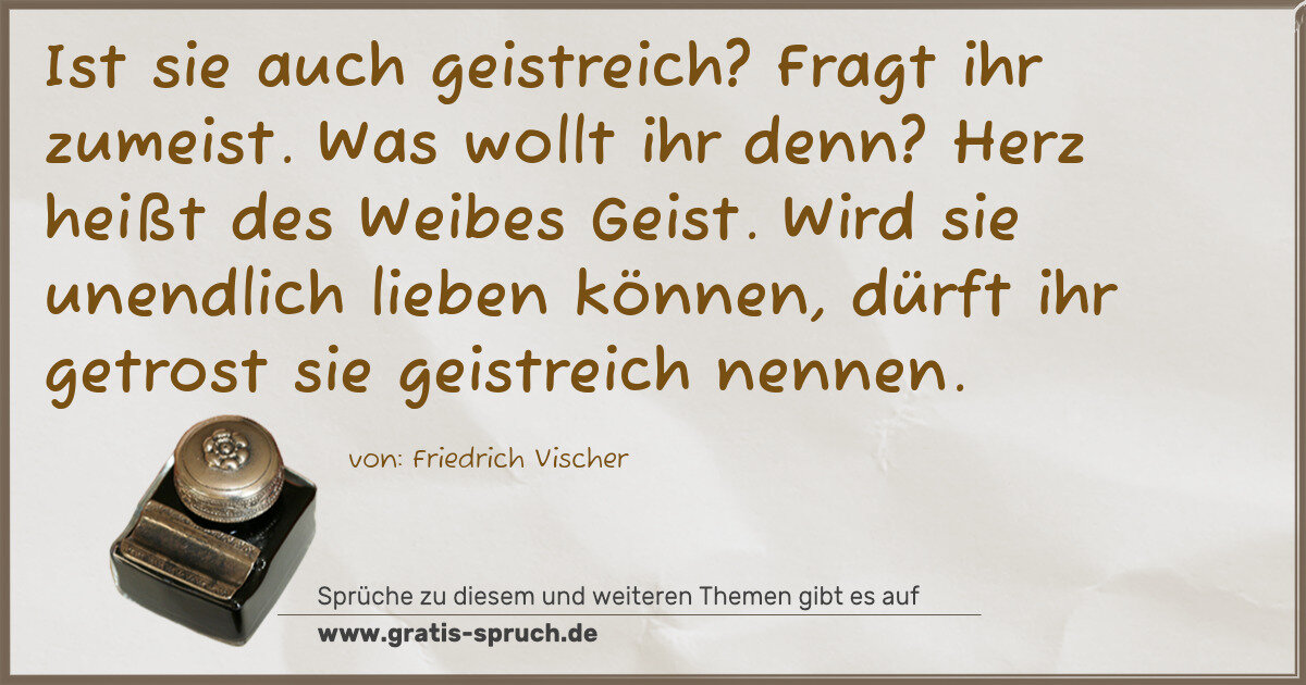 Ist sie auch geistreich? Fragt ihr zumeist. Was wollt ihr denn? Herz heißt des Weibes Geist. Wird sie unendlich lieben können, dürft ihr getrost sie geistreich nennen.