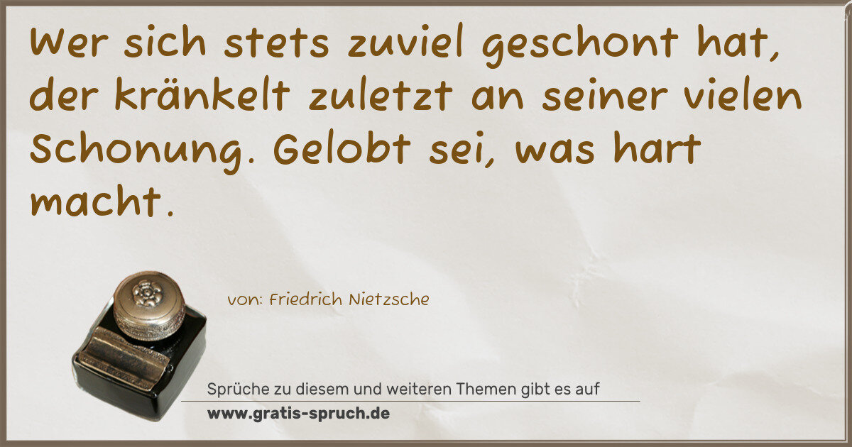 Wer sich stets zuviel geschont hat, der kränkelt zuletzt an seiner vielen Schonung. Gelobt sei, was hart macht.