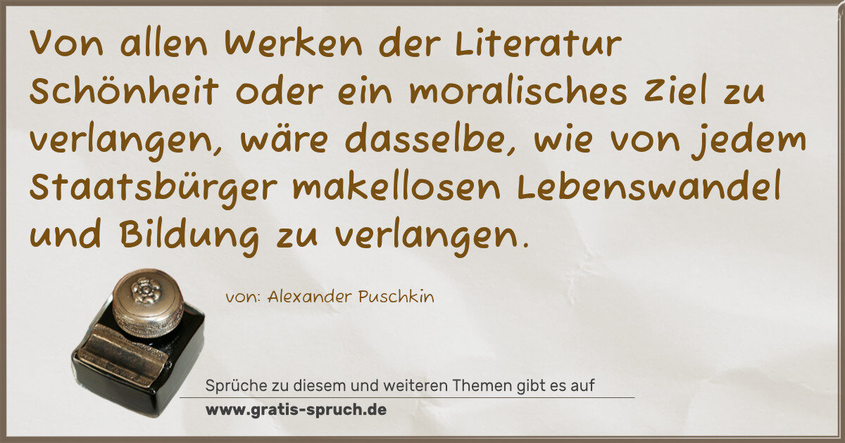 Von allen Werken der Literatur Schönheit oder ein moralisches Ziel zu verlangen, wäre dasselbe, wie von jedem Staatsbürger makellosen Lebenswandel und Bildung zu verlangen.
