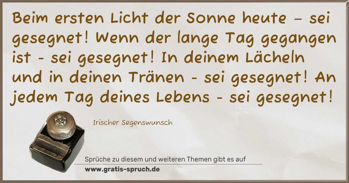 Beim ersten Licht der Sonne heute – sei gesegnet! Wenn der lange Tag gegangen ist - sei gesegnet! In deinem Lächeln und in deinen Tränen - sei gesegnet! An jedem Tag deines Lebens - sei gesegnet!