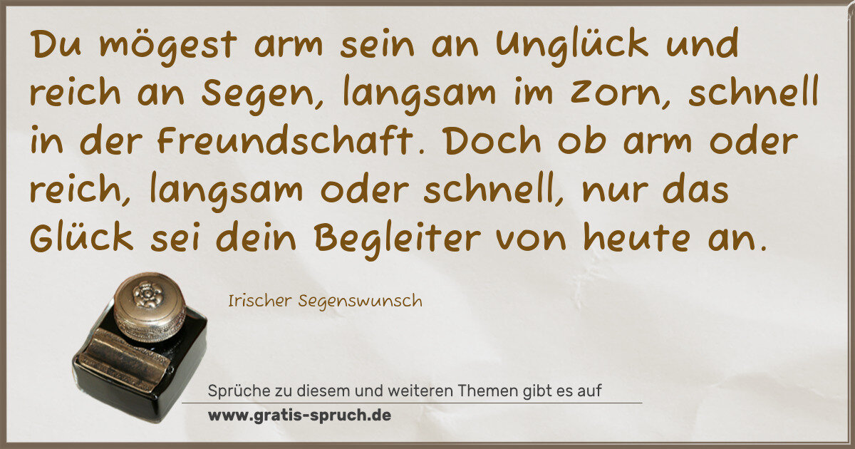 Du mögest arm sein an Unglück und reich an Segen, langsam im Zorn, schnell in der Freundschaft. Doch ob arm oder reich, langsam oder schnell, nur das Glück sei dein Begleiter von heute an.