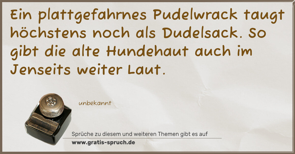 Ein plattgefahrnes Pudelwrack taugt höchstens noch als Dudelsack. So gibt die alte Hundehaut auch im Jenseits weiter Laut.