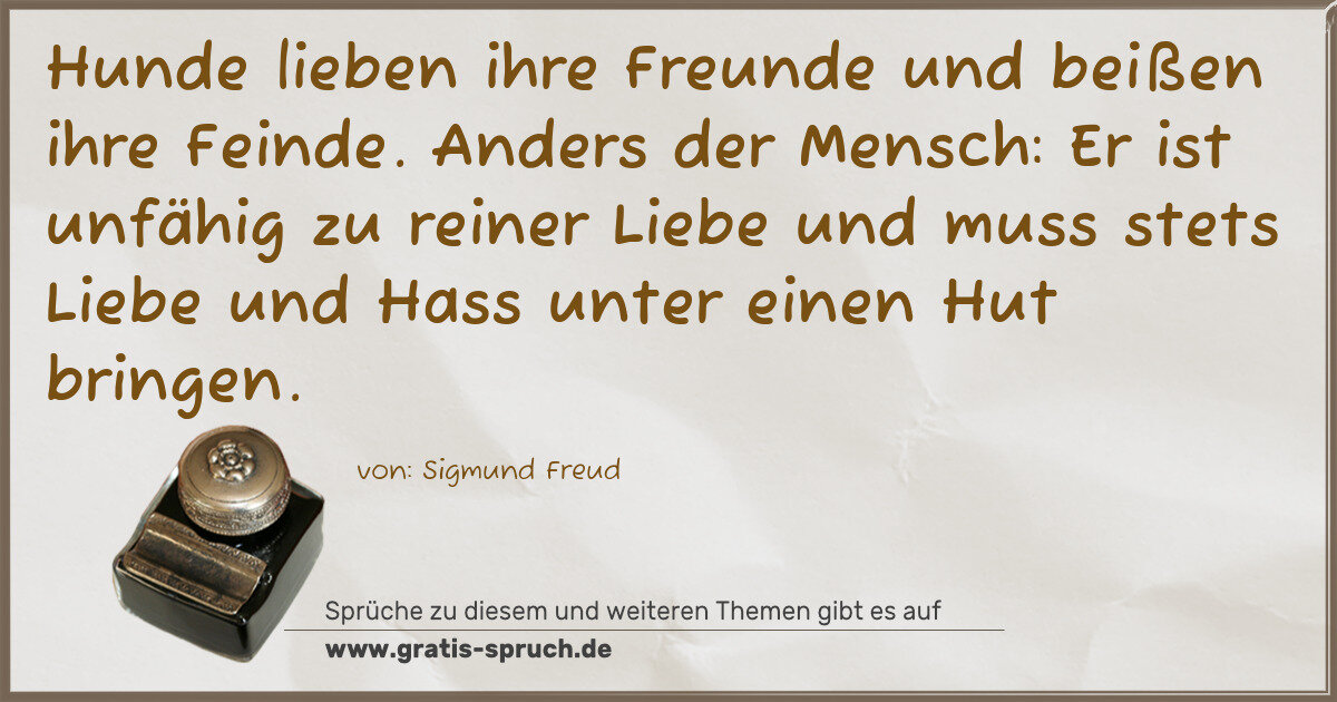 Hunde lieben ihre Freunde und beißen ihre Feinde. Anders der Mensch: Er ist unfähig zu reiner Liebe und muss stets Liebe und Hass unter einen Hut bringen.