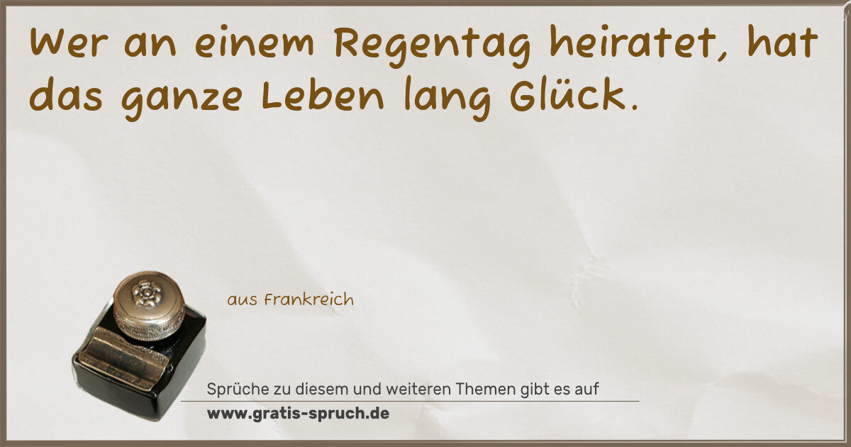 ❝Wer an einem Regentag heiratet, hat das ganze Leben lang Glück.ThemenEheHochzeitGlückAusdauerLebenWeitere Ehe Sprüche →Ähnliche SprücheLiebe ist in dem, der liebt, nicht in dem, der geliebt wird.— PlatonHast du einen Menschen gern, musst du ihn verstehen und nicht hier und da und dort nur nach seinen Fehlern sehen. Scha …Das höchste Glück des Lebens besteht in der Überzeugung, geliebt zu werden.— Victor-Marie Hugo