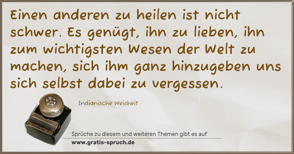 Einen anderen zu heilen ist nicht schwer. Es genügt, ihn zu lieben, ihn zum wichtigsten Wesen der Welt zu machen, sich ihm ganz hinzugeben uns sich selbst dabei zu vergessen.