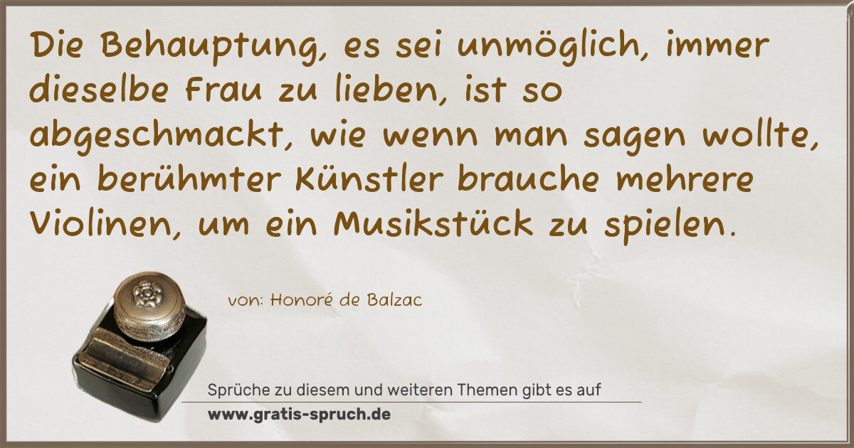 Die Behauptung, es sei unmöglich, immer dieselbe Frau zu lieben, ist so abgeschmackt, wie wenn man sagen wollte, ein berühmter Künstler brauche mehrere Violinen, um ein Musikstück zu spielen.