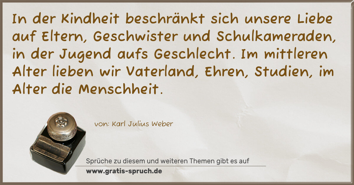 In der Kindheit beschränkt sich unsere Liebe auf Eltern, Geschwister und Schulkameraden, in der Jugend aufs Geschlecht. Im mittleren Alter lieben wir Vaterland, Ehren, Studien, im Alter die Menschheit.