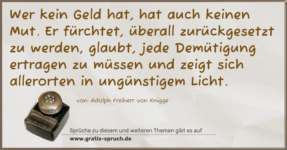 Wer kein Geld hat, hat auch keinen Mut. Er fürchtet, überall zurückgesetzt zu werden, glaubt, jede Demütigung ertragen zu müssen und zeigt sich allerorten in ungünstigem Licht.