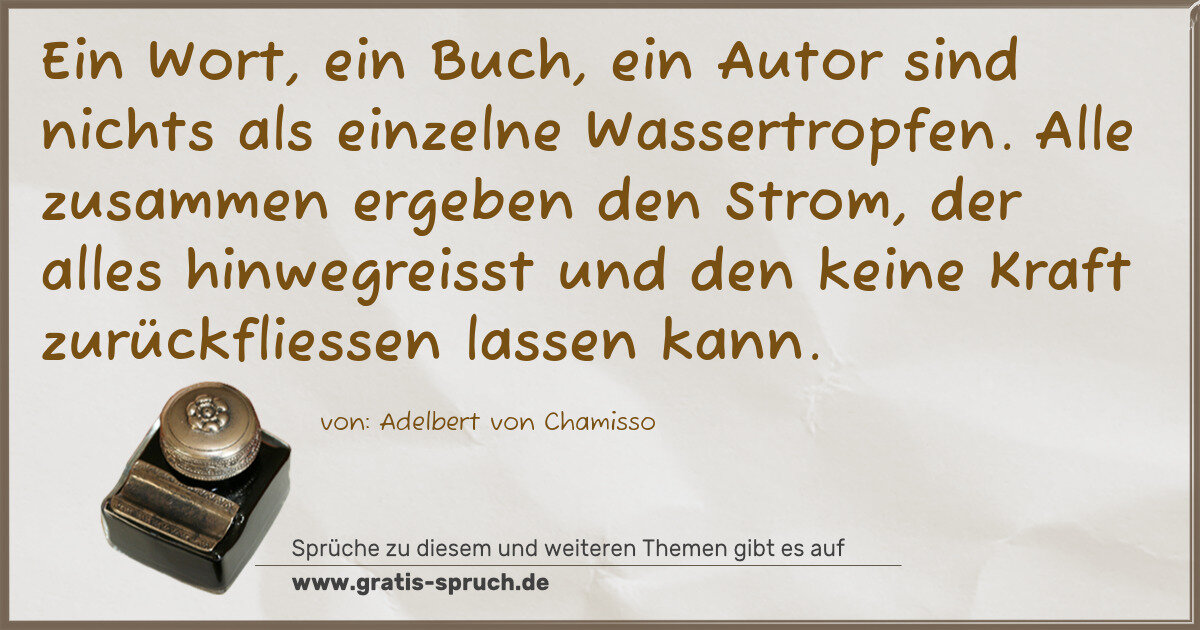 Ein Wort, ein Buch, ein Autor sind nichts als einzelne Wassertropfen. Alle zusammen ergeben den Strom, der alles hinwegreisst und den keine Kraft zurückfliessen lassen kann.