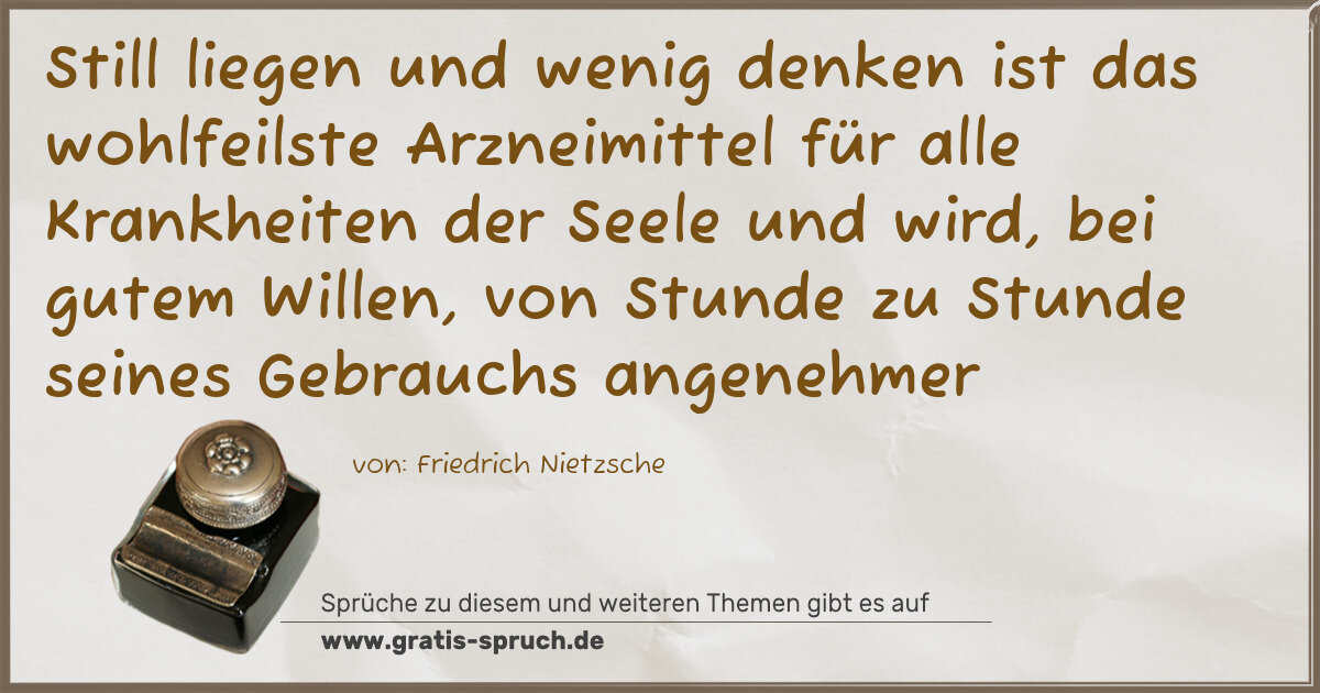 Still liegen und wenig denken ist das wohlfeilste Arzneimittel für alle Krankheiten der Seele und wird, bei gutem Willen, von Stunde zu Stunde seines Gebrauchs angenehmer