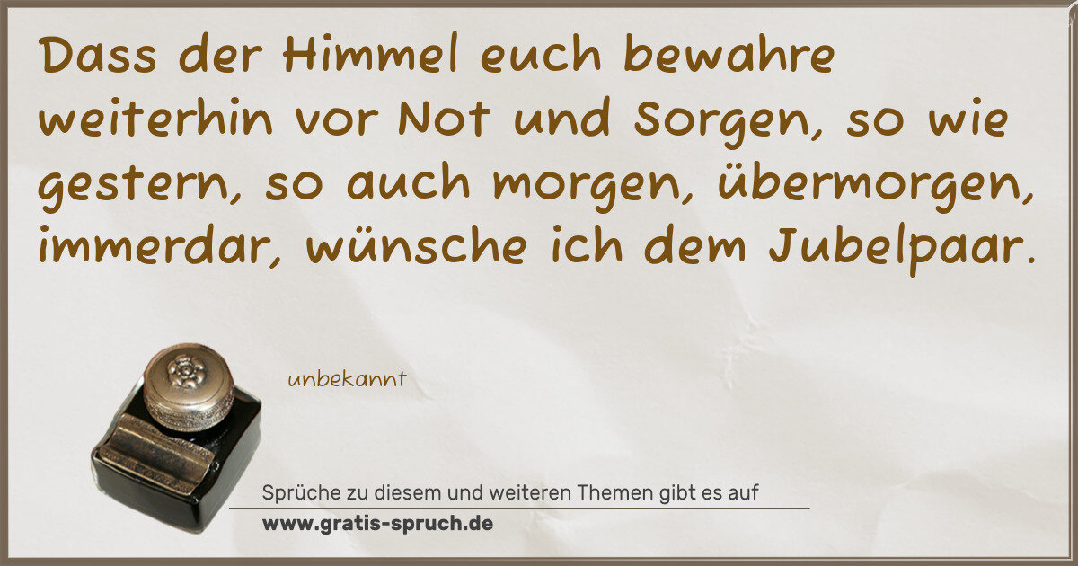Dass der Himmel euch bewahre weiterhin vor Not und Sorgen, so wie gestern, so auch morgen, übermorgen, immerdar, wünsche ich dem Jubelpaar.