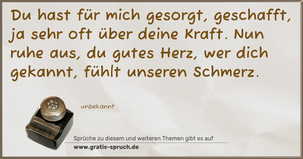 Du hast für mich gesorgt, geschafft, ja sehr oft über deine Kraft. Nun ruhe aus, du gutes Herz, wer dich gekannt, fühlt unseren Schmerz.