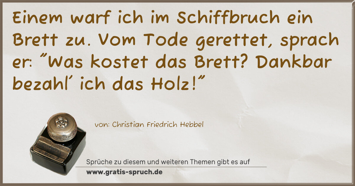 Einem warf ich im Schiffbruch ein Brett zu. Vom Tode gerettet, sprach er: "Was kostet das Brett? Dankbar bezahl' ich das Holz!"