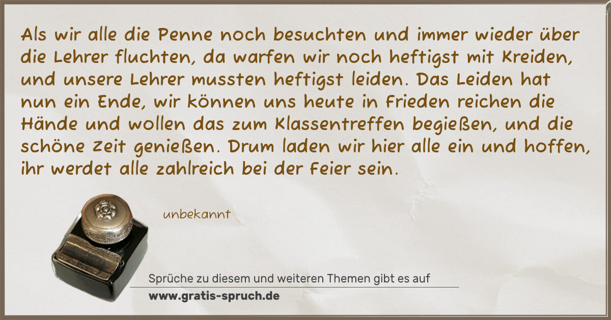 Als wir alle die Penne noch besuchten und immer wieder über die Lehrer fluchten, da warfen wir noch heftigst mit Kreiden, und unsere Lehrer mussten heftigst leiden. Das Leiden hat nun ein Ende, wir können uns heute in Frieden reichen die Hände und wollen das zum Klassentreffen begießen, und die schöne Zeit genießen. Drum laden wir hier alle ein und hoffen, ihr werdet alle zahlreich bei der Feier sein.